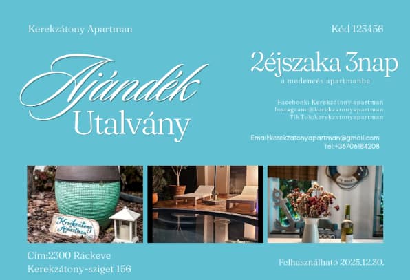 Ajándékutalvány vásárlásával egy felejthetetlen pihenést ajándékozhatsz szeretteidnek a Kerekzátony Apartmanba. Emellett rugalmasan alkalmazkodunk az egyedi igényekhez, legyen szó névre szóló ajándékutalványról, amelyet akár konkrét napokra, akár tetszőleges összegben is kérheted. Így a meglepetés igazán személyre szabott lehet.